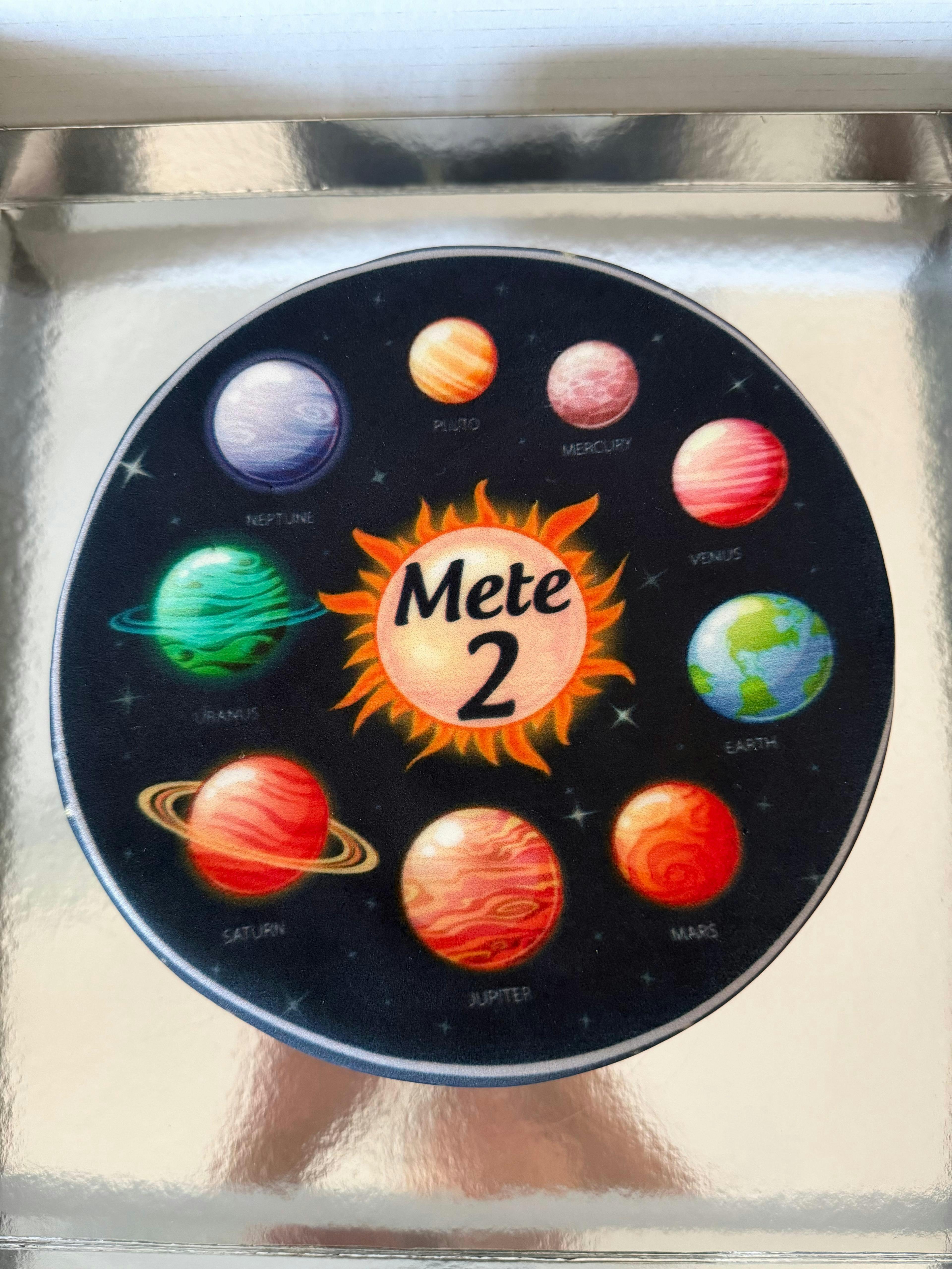 Minik uzay kaşifleri için hazırlanan bu büyüleyici Güneş Sistemi temalı pasta, eğlence ve keşif dolu bir doğum günü deneyimi sunuyor! Güneş’in etrafında sıralanmış Plüton'dan Jüpiter’e, Dünya’dan Mars’a kadar tüm gezegenleri içeren bu tasarım, bilime ve uzaya ilgi duyan çocuklar için harika bir seçim. Kişiye özel isim ve yaş eklenebilen bu gezegenli pasta, hem eğitici hem de göz alıcı bir detayla partilere renk katıyor. Uzay temalı doğum günü konseptleri için mükemmel tamamlayıcı!