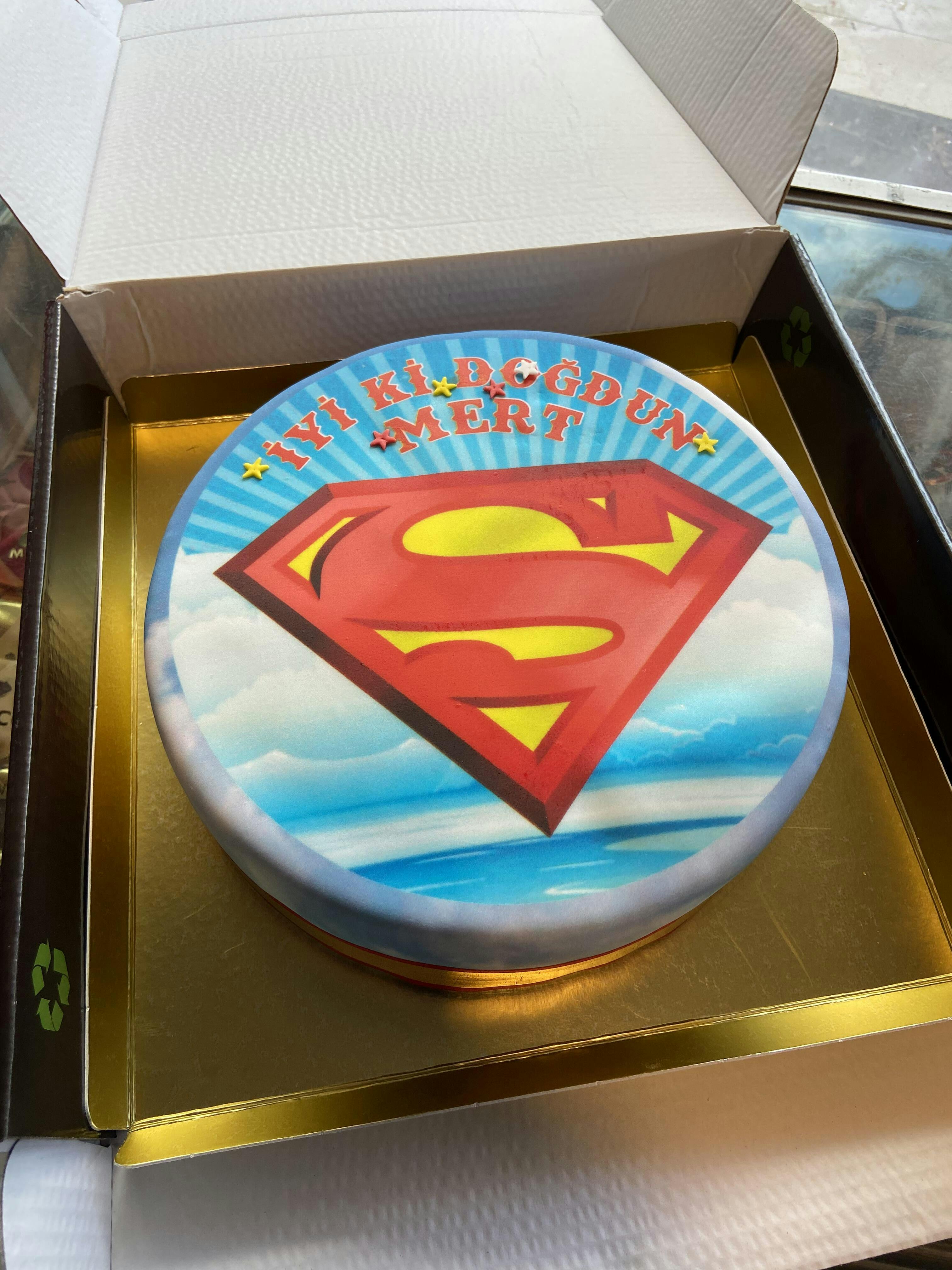 Çocukların çok sevdiği süper kahramanlardan biri olan Superman çocuk ve genç pastalarında! Superman logosu tasarımı ile Superman hayranları için ideal olan yuvarlak modeldeki pastamız, mavi çizgi detayları ile süsleniyor. Kenarlarında ise bulut tasarımına yer verilen süper kahraman tasarım pastası, etrafını çevreleyen kırmızı kurdele ile süsleniyor. Sade ve şık bir tasarıma sahip olan pasta modelimiz üzerinde yer alan oyuncak ile dikkat çekmeyi başarıyor. Superman oyuncağı hediye pasta sahibine güzel bir oyuncak veya hatıra olacaktır.