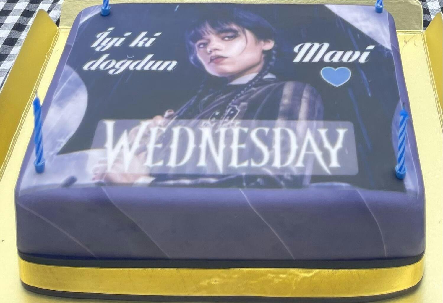 Son zamanların hit dizisi Wednesday'in efsanevi baş kahramanı ile süslenen pasta modelimiz koyu ve kasvetli teması ile dizinin ruhunu partilerinize taşıyacak. İkonik Addams Ailesi'nin tek kızları olan Wednesday Addams yaşıtlarından farklı olan kişiliği, karanlık ve mizahi yönüyle birçok kişiyi ekrana kitledi. Hep ördüğü siyah saçları ve siyah kıyafetleri ile akıllara kazınan bu zeki kız koyu mor renkteki pasta ile birleşince ortaya unutulmaz ve eşsiz bir tasarım çıktı! Wednesday Pastası Wednesday hayranı olan sevdikleriniz için mükemmel bir sürpriz olacak.